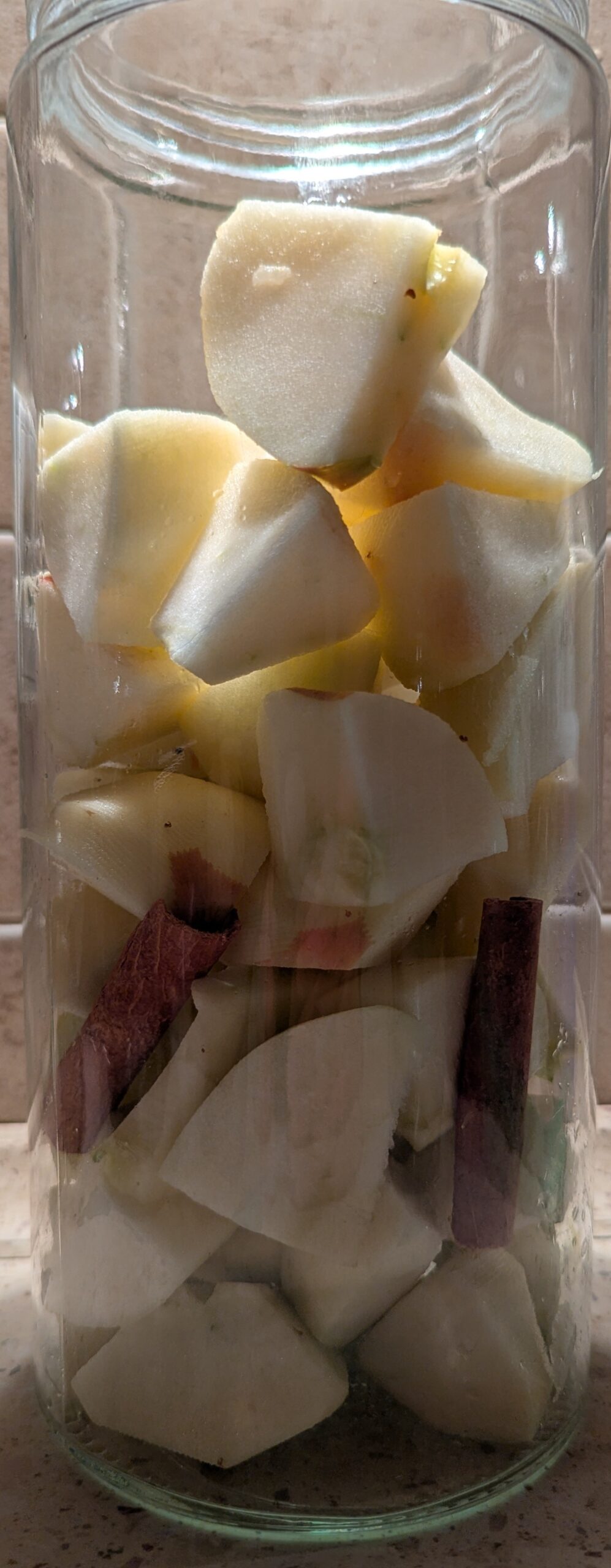 Wrzuć jabłka do dużego słoja i dodaj pałki cynamonu oraz goździki.