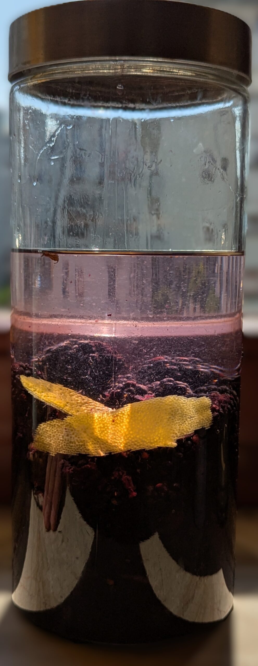 Zalej całość bimbrem 50–55%. Zakręć szczelnie i odstaw w ciemne miejsce na 5–6 tygodni.