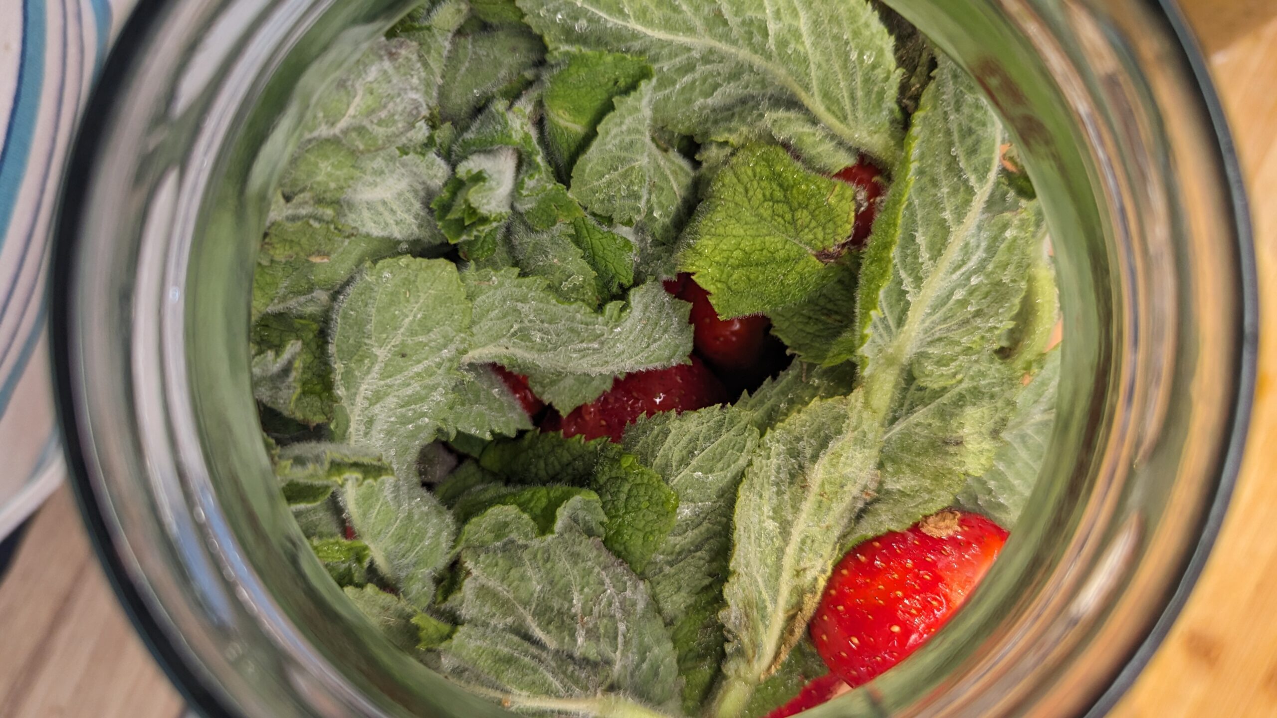 Wrzucić truskawki do słoja i na końcu wrzucić mięte.