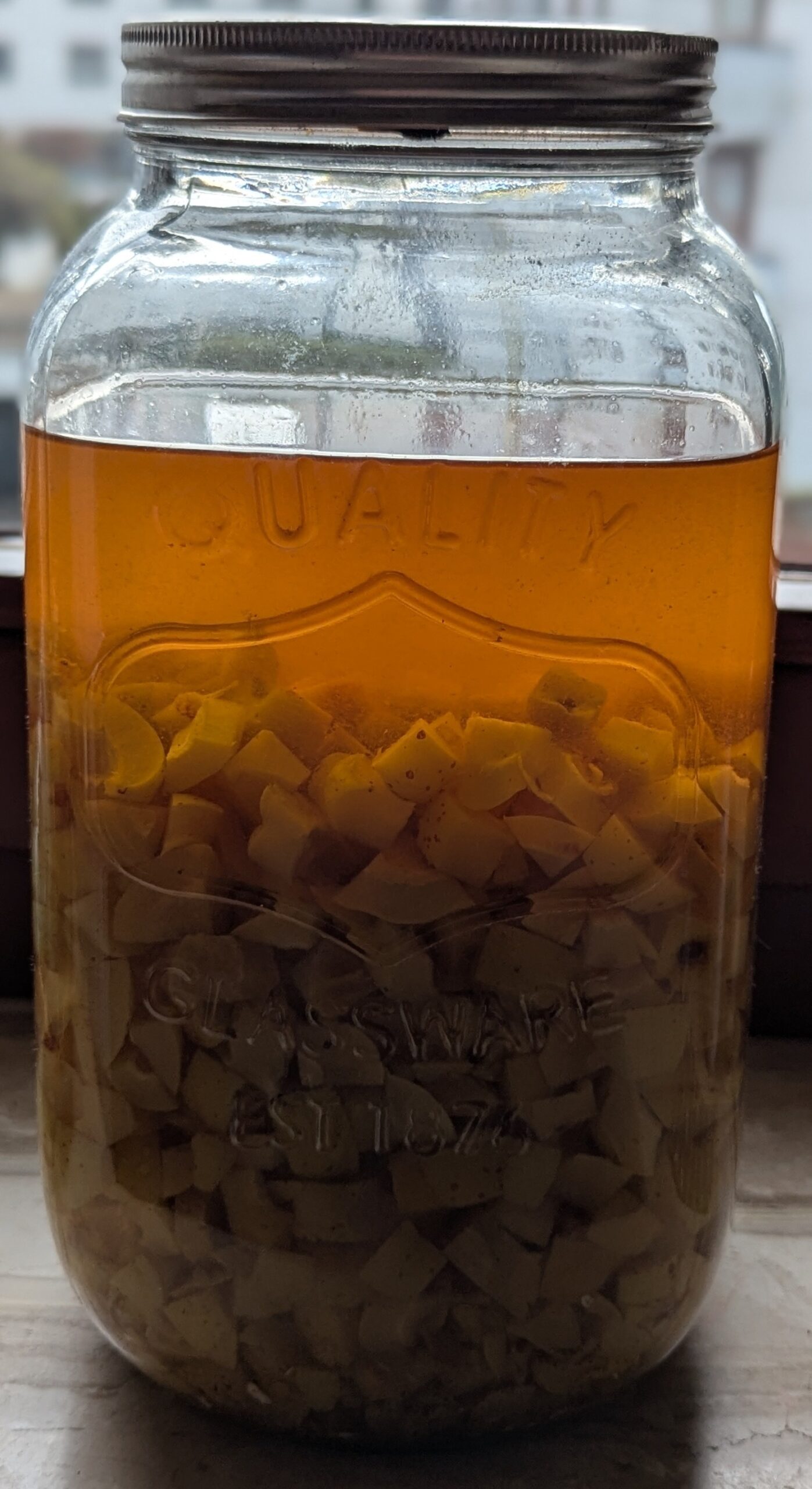 Połącz obie frakcje, dokładnie wymieszaj. Odstaw na 2–3 tygodnie w chłodne miejsce. Po opadnięciu osadu przefiltruj.